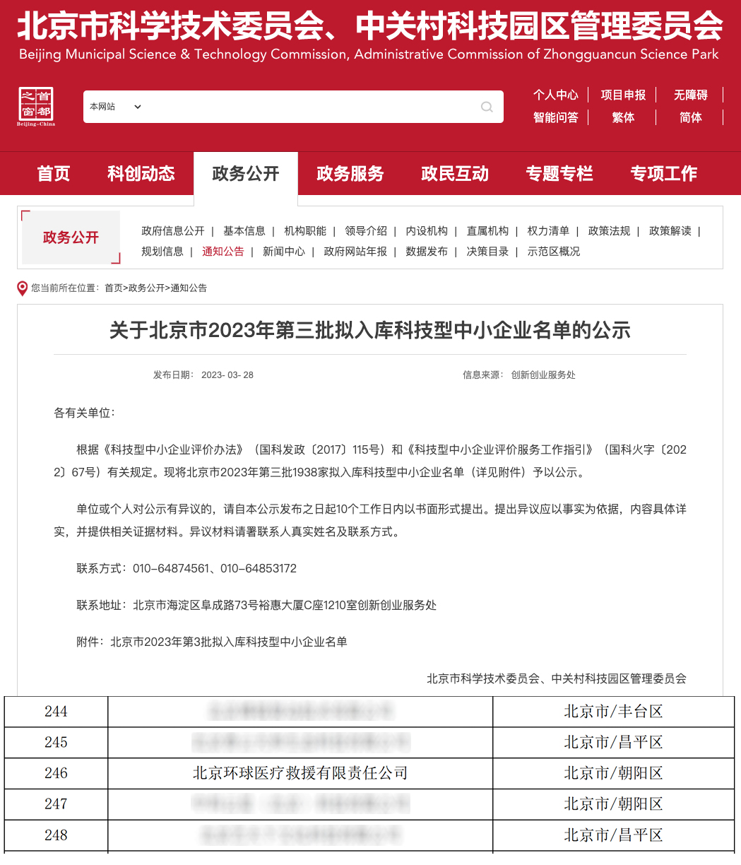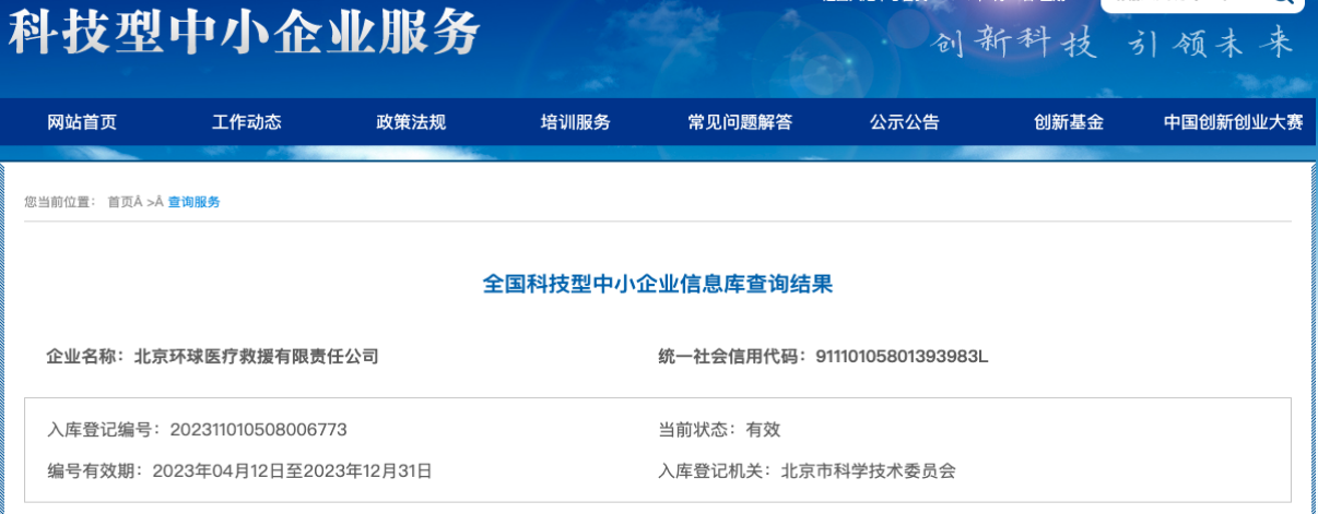 近日,经北京市科学技术委员会审核,北京环球医疗救援有限责任公司(以下简称“北京环球医疗)再次获得科技型中小企业认定。